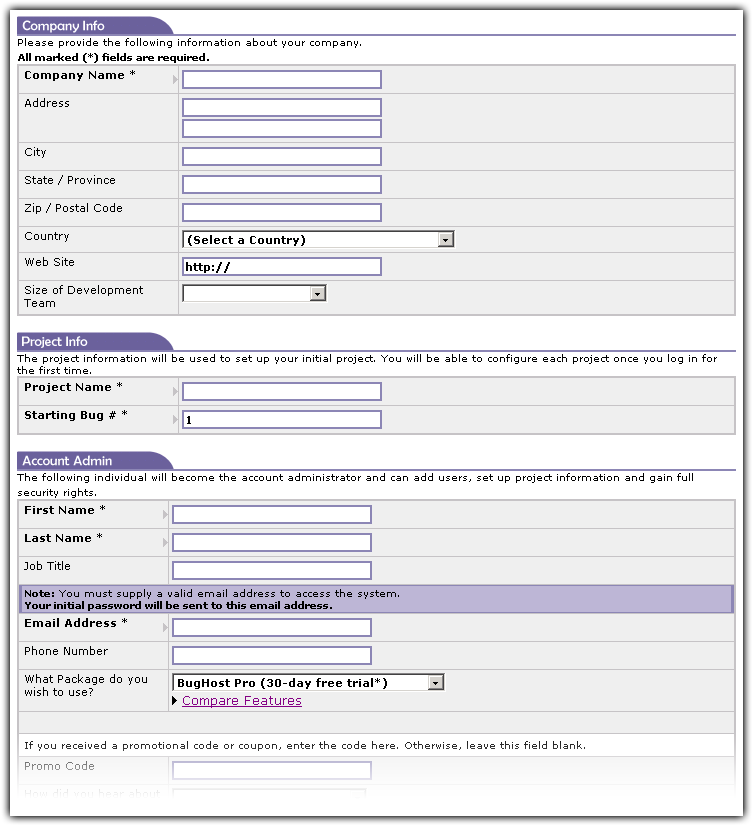 Project Name This will be the name of the initial project. If you are using BugHost Standard or BugHost Professional, you may add more projects after you sign in for the first time.