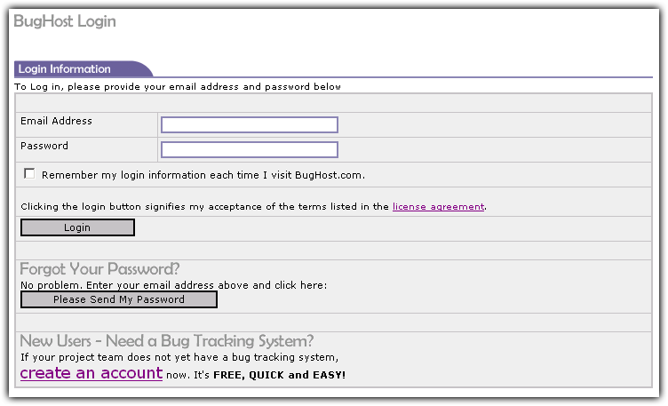 If you have never logged in before, you will have to wait until you receive your random password from the BugHost system. If you did not receive your password, you may have entered your email address incorrectly.